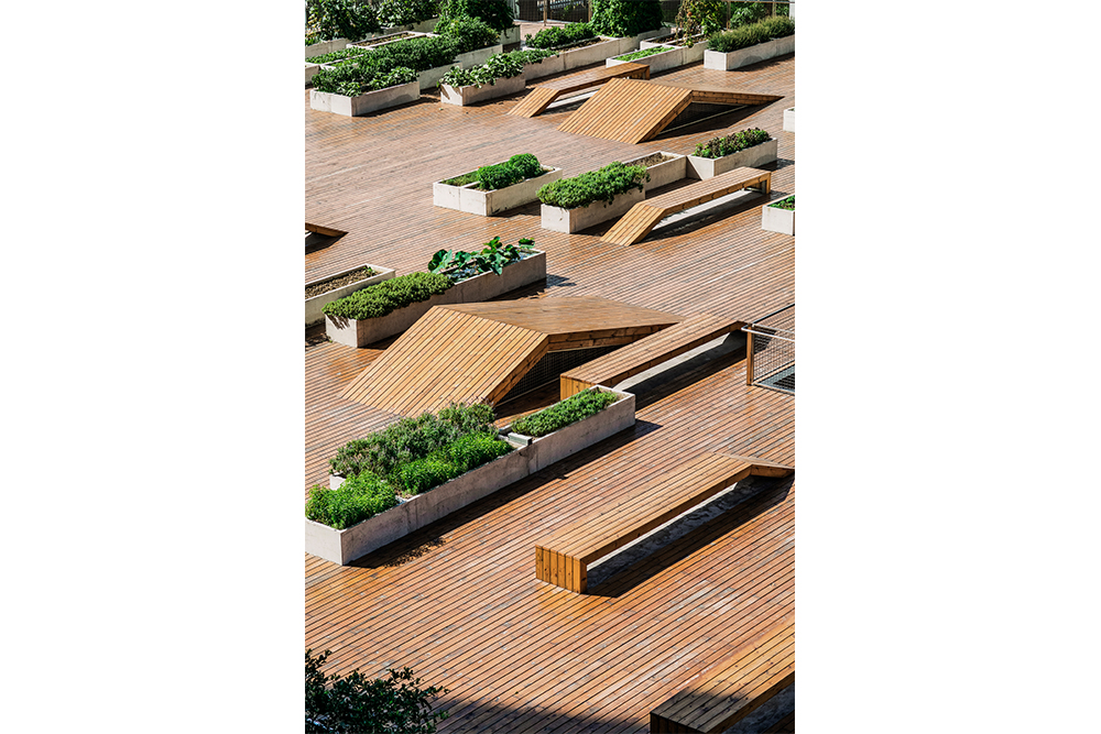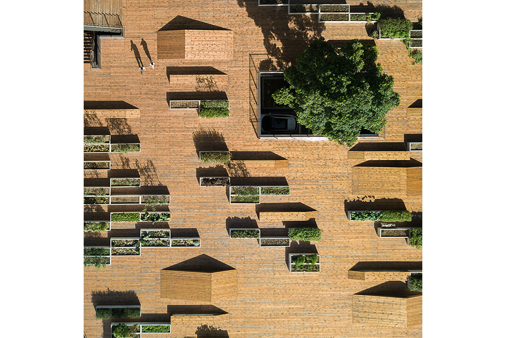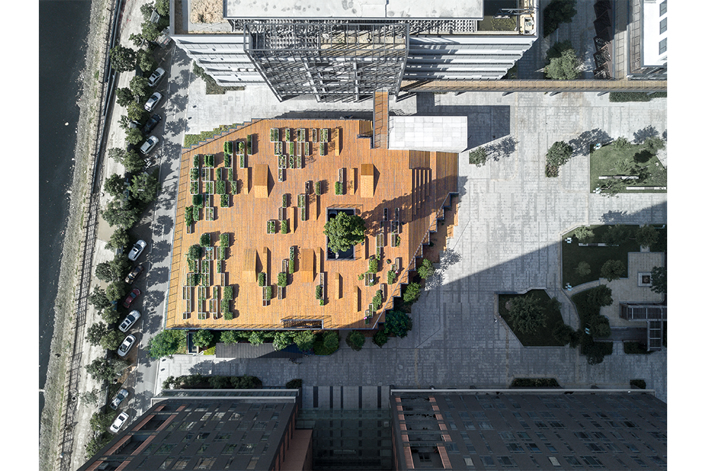 在原有的园区整体布局中,内庭院的西侧是一个室外停车场。为了改善庭院的空间效果和保留停车功能的需求,停车场的上方增添了景观大平台。通过台阶的设置,大平台成为内庭院空间的延续,从而形成不同标高的公共空间体系,而台阶也成为内庭院举办户外活动时的观众座椅。平台上布满了错落有致的混凝土种植槽,不同喜好的人栽种不一样的农作物和灌木花草,形成有趣生动的景观。平台上的大洞口为下面的停车场提供良好的采光,而洞口中间的香樟大树也为停车空间提供绿意。此外,清水混凝土材质的种植体验馆坐落在大平台的东北角,它为种植爱好者提供学习交流的场所。一层作为公共功能包含了展示、交流和讲座的功能,二层则是种植操作空间和培训功能。两层高的植物绿墙展示着各式各样的植物,小小的两层通高空间成为亲密而有互动的交流学习场所。内部悬空的楼梯与悬挂着的楼板让这小巧的建筑显得灵巧。同时,建筑内不同标高的两个入口使大平台、室内空间和内庭院三者之间建立更紧密的联系。