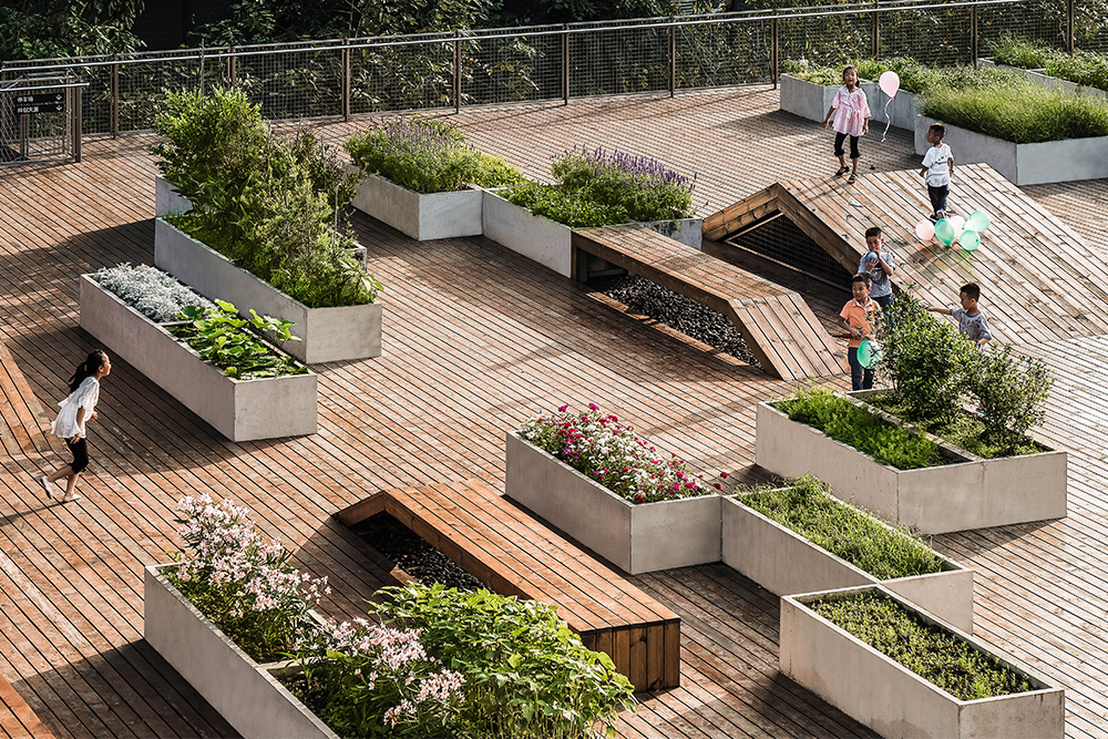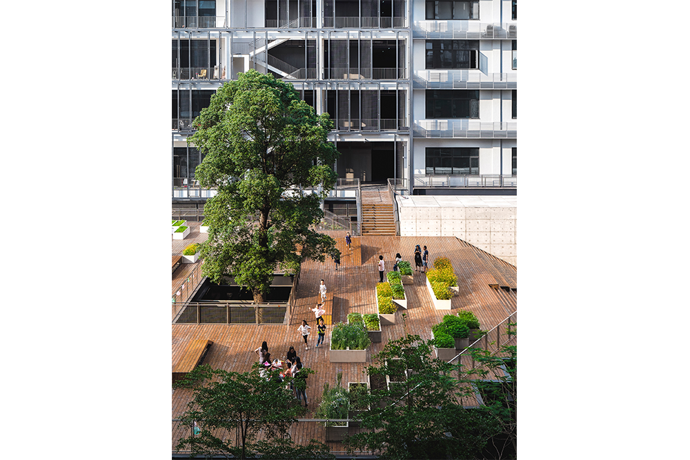 In the original site layout, there is an outdoor parking lot in the west next to the courtyard. In order to meet the demand for parking, and to improve the spatial quality of the courtyard, a large landscaped terrace was created which covers the parking lot. Connecting by the steps, this large terrace becomes the extension of the courtyard, with which the courtyard establishes the public space system of different levels, and the steps could provide seats for audience when outdoor activities are held in the courtyard. Concrete planting troughs are randomly placed on the terrace, where people can plant various crops and shrubs, depending on their individual preferences, so that these crops and shrubs create interesting and vivid landscape. The big hole on the terrace provides better sunlight for the parking lot below, and the cinnamomum camphora in the middle of the hole also provides greenery for parking. At the same time, in the northeast of the terrace, there is a planting pavilion made of exposed concrete, which brings plant lovers together to learn from one another. The first floor is a public space for exhibition, communication and lectures, while program of the second floor is a planting and training space. The two-storey height green vegetation wall exhibits various plants, while the two-storey height space becomes learning place for people to communicate and interact with each other. The cantilevered staircase and the hanging floor in the building make it light and delicate. At the same time, the two entrances with different levels in the building create a closer connection among the terrace, the interior space and the courtyard.