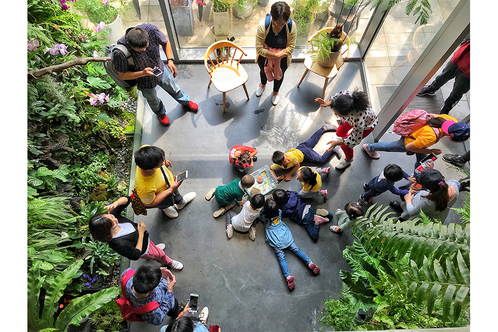 在原有的园区整体布局中,内庭院的西侧是一个室外停车场。为了改善庭院的空间效果和保留停车功能的需求,停车场的上方增添了景观大平台。通过台阶的设置,大平台成为内庭院空间的延续,从而形成不同标高的公共空间体系,而台阶也成为内庭院举办户外活动时的观众座椅。平台上布满了错落有致的混凝土种植槽,不同喜好的人栽种不一样的农作物和灌木花草,形成有趣生动的景观。平台上的大洞口为下面的停车场提供良好的采光,而洞口中间的香樟大树也为停车空间提供绿意。此外,清水混凝土材质的种植体验馆坐落在大平台的东北角,它为种植爱好者提供学习交流的场所。一层作为公共功能包含了展示、交流和讲座的功能,二层则是种植操作空间和培训功能。两层高的植物绿墙展示着各式各样的植物,小小的两层通高空间成为亲密而有互动的交流学习场所。内部悬空的楼梯与悬挂着的楼板让这小巧的建筑显得灵巧。同时,建筑内不同标高的两个入口使大平台、室内空间和内庭院三者之间建立更紧密的联系。