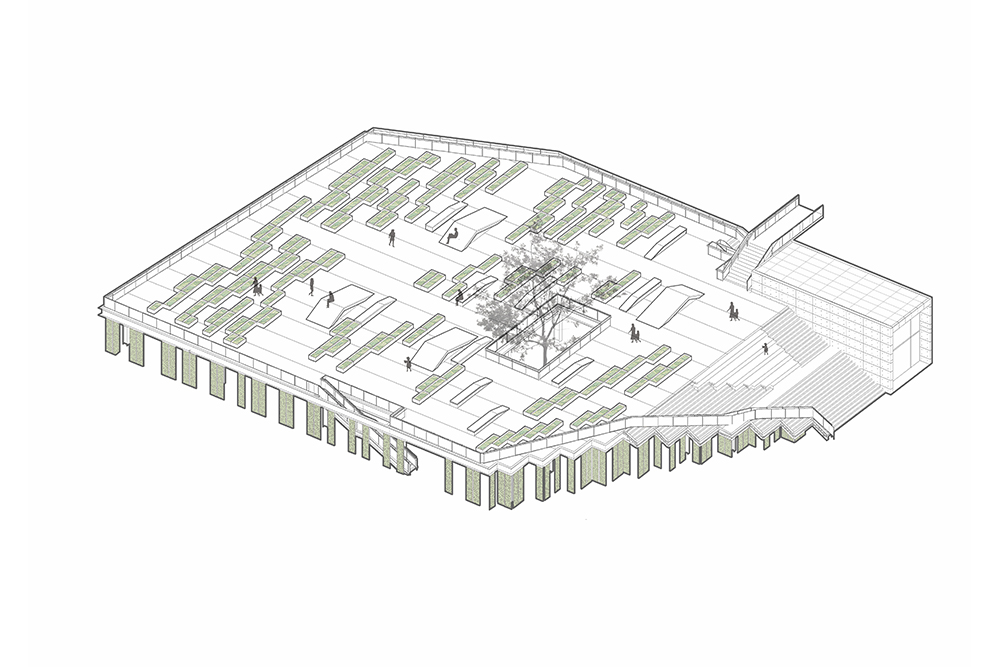 In the original site layout, there is an outdoor parking lot in the west next to the courtyard. In order to meet the demand for parking, and to improve the spatial quality of the courtyard, a large landscaped terrace was created which covers the parking lot. Connecting by the steps, this large terrace becomes the extension of the courtyard, with which the courtyard establishes the public space system of different levels, and the steps could provide seats for audience when outdoor activities are held in the courtyard. Concrete planting troughs are randomly placed on the terrace, where people can plant various crops and shrubs, depending on their individual preferences, so that these crops and shrubs create interesting and vivid landscape. The big hole on the terrace provides better sunlight for the parking lot below, and the cinnamomum camphora in the middle of the hole also provides greenery for parking. At the same time, in the northeast of the terrace, there is a planting pavilion made of exposed concrete, which brings plant lovers together to learn from one another. The first floor is a public space for exhibition, communication and lectures, while program of the second floor is a planting and training space. The two-storey height green vegetation wall exhibits various plants, while the two-storey height space becomes learning place for people to communicate and interact with each other. The cantilevered staircase and the hanging floor in the building make it light and delicate. At the same time, the two entrances with different levels in the building create a closer connection among the terrace, the interior space and the courtyard.