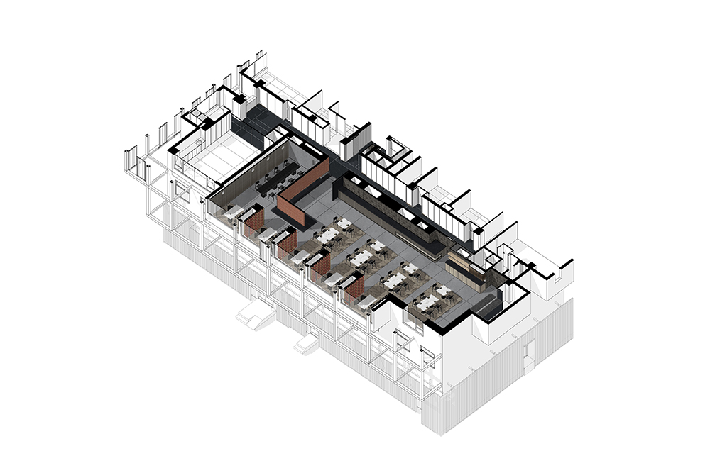 原有建筑低矮层高的缺点随着大空间尺度及层次的处理而被巧妙消解。设计通过强化梁与墙体的连续感以及对应的地面铺装材料划分和吊顶空间的限定,将大空间切分为不同的就餐区域。