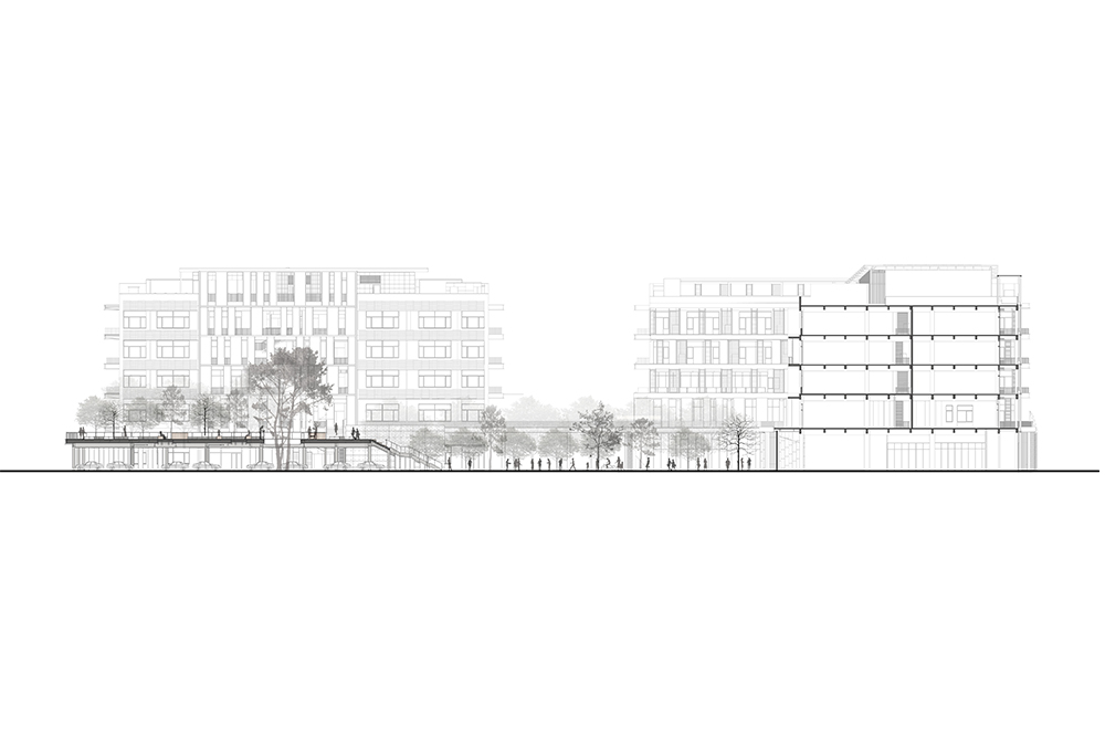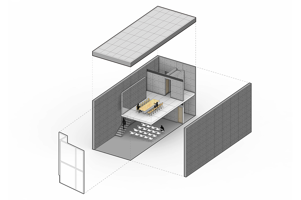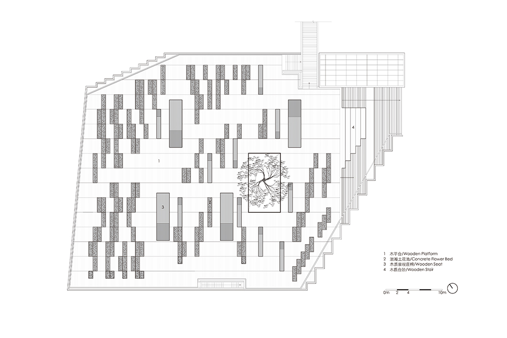 In the original site layout, there is an outdoor parking lot in the west next to the courtyard. In order to meet the demand for parking, and to improve the spatial quality of the courtyard, a large landscaped terrace was created which covers the parking lot. Connecting by the steps, this large terrace becomes the extension of the courtyard, with which the courtyard establishes the public space system of different levels, and the steps could provide seats for audience when outdoor activities are held in the courtyard. Concrete planting troughs are randomly placed on the terrace, where people can plant various crops and shrubs, depending on their individual preferences, so that these crops and shrubs create interesting and vivid landscape. The big hole on the terrace provides better sunlight for the parking lot below, and the cinnamomum camphora in the middle of the hole also provides greenery for parking. At the same time, in the northeast of the terrace, there is a planting pavilion made of exposed concrete, which brings plant lovers together to learn from one another. The first floor is a public space for exhibition, communication and lectures, while program of the second floor is a planting and training space. The two-storey height green vegetation wall exhibits various plants, while the two-storey height space becomes learning place for people to communicate and interact with each other. The cantilevered staircase and the hanging floor in the building make it light and delicate. At the same time, the two entrances with different levels in the building create a closer connection among the terrace, the interior space and the courtyard.