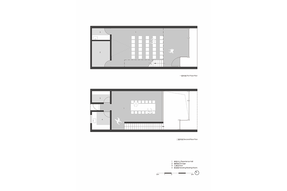 在原有的园区整体布局中,内庭院的西侧是一个室外停车场。为了改善庭院的空间效果和保留停车功能的需求,停车场的上方增添了景观大平台。通过台阶的设置,大平台成为内庭院空间的延续,从而形成不同标高的公共空间体系,而台阶也成为内庭院举办户外活动时的观众座椅。平台上布满了错落有致的混凝土种植槽,不同喜好的人栽种不一样的农作物和灌木花草,形成有趣生动的景观。平台上的大洞口为下面的停车场提供良好的采光,而洞口中间的香樟大树也为停车空间提供绿意。此外,清水混凝土材质的种植体验馆坐落在大平台的东北角,它为种植爱好者提供学习交流的场所。一层作为公共功能包含了展示、交流和讲座的功能,二层则是种植操作空间和培训功能。两层高的植物绿墙展示着各式各样的植物,小小的两层通高空间成为亲密而有互动的交流学习场所。内部悬空的楼梯与悬挂着的楼板让这小巧的建筑显得灵巧。同时,建筑内不同标高的两个入口使大平台、室内空间和内庭院三者之间建立更紧密的联系。