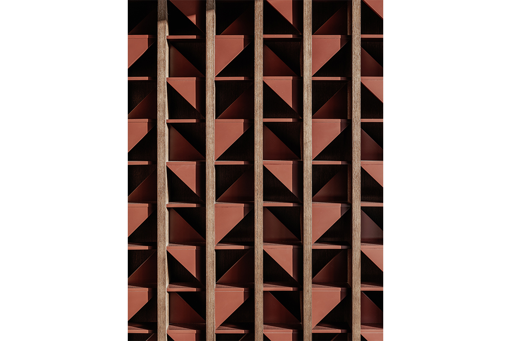 餐厅的室内色彩延续建筑外立面的色系,窗边的天花吊顶用不均匀的嫣红水泥纹路质感来衬托窗外的自然风景。同时用深色木格栅墙面辅以搭配,打造沉稳静谧的就餐氛围。清晨东向阳光筛落树影,营造温暖明亮的早餐氛围。随着一天中时间和光线的变化,色温由暖转中性,也顺应着早餐至下午茶的功能转换。