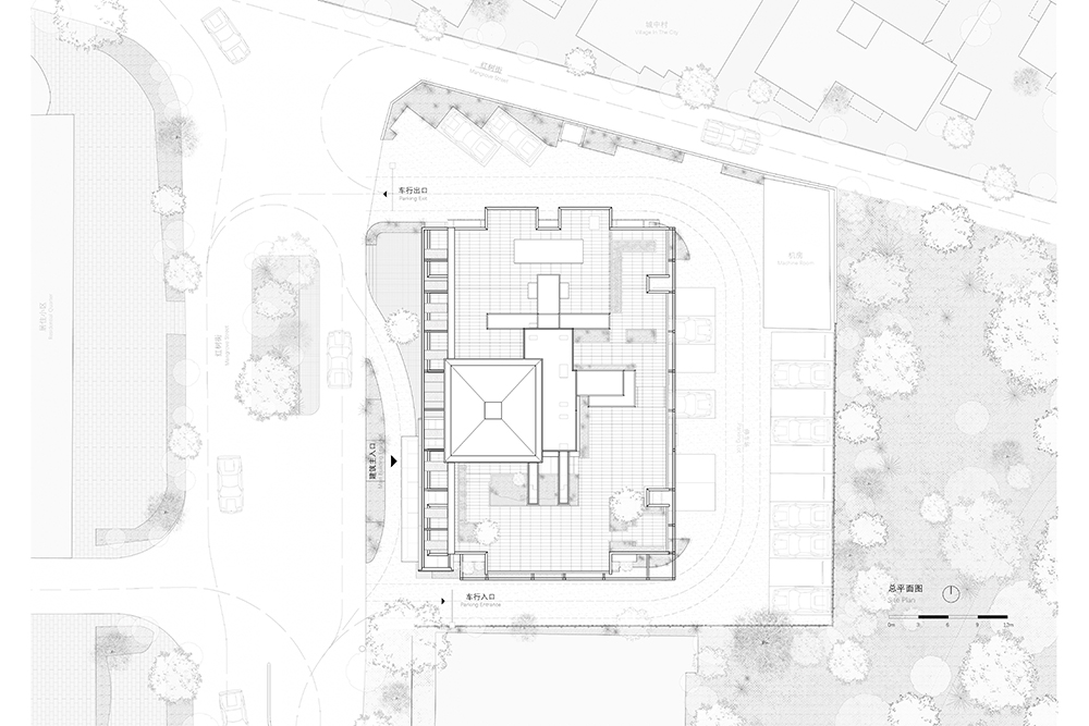 Due to property rights, the first-floor lobby is cramped and can only meet the basic functions of reception and waiting. At the same time, the lobby entrance faces the west sun and the road with messy parking, which has a poor visual experience. Therefore, the design adopts a space treatment method of first suppressing and then promoting. The hotel entrance is isolated from the west sun and the complicated street scene with a solid wall, leaving only the transparent glass surface of the entrance, and using the narrow southern courtyard to guide light and create landscape inside the lobby. In the relatively closed main facade, guests enter the hotel lobby from the transparent and conspicuous entrance porch, and their sight is directed to the pure side courtyard landscape on the south side. The space is progressive, creating a small-to-large space experience.