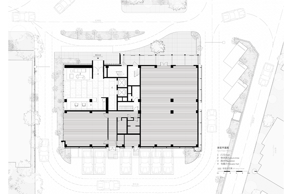 受限于产权条件,首层大堂空间局促,仅能满足前台招待和座椅等待的基础功能。同时大堂入口直面西晒与杂乱停车的马路,视觉体验感差。因此设计采用先抑后扬的空间处理手法,将酒店入口面以实墙隔绝西晒与纷杂街景,仅留入口通透玻璃面,并利用南向窄庭为大堂内部引光造景。在较为封闭的主立面中,客人从通透而显眼的入口门廊进入酒店大堂,视线被引至南侧纯净的边庭景观,空间层层递进,创造出小中见大的空间体验。