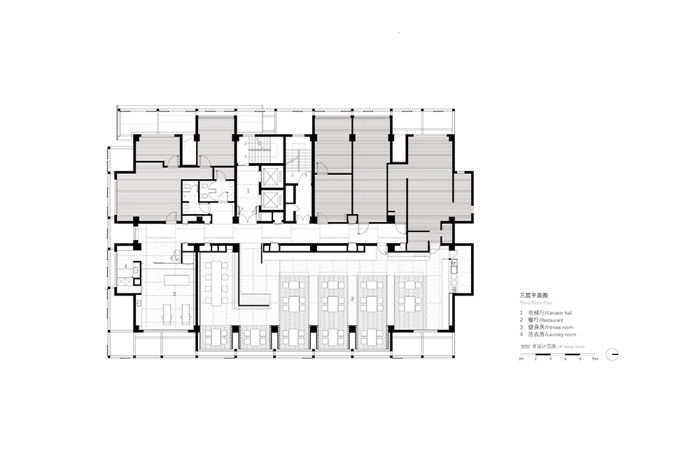 The shortcomings of the original building's low floor height are cleverly eliminated with the treatment of large spatial scale and level. The original building height of third floor is as low as the guest room floor. The design divides the large space into different dining areas by strengthening the continuity between beams and walls, and the corresponding division of floor paving materials and limitation of ceiling space.